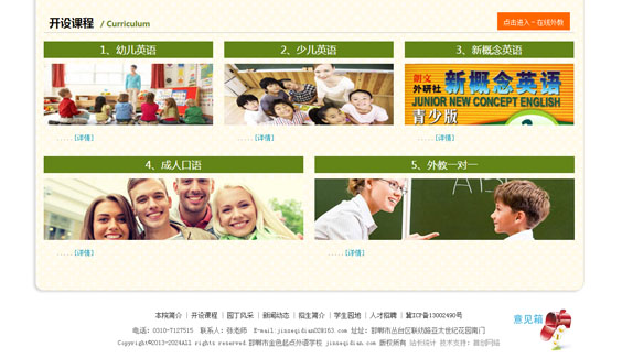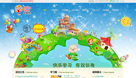 負(fù)責(zé)邯鄲市金色起點(diǎn)外語學(xué)校網(wǎng)站設(shè)計(jì)制作開發(fā)等網(wǎng)站建設(shè)服務(wù),金色起點(diǎn)是一所面向兒童的外語高級(jí)培訓(xùn)學(xué)校,故網(wǎng)站設(shè)計(jì)時(shí)注重活潑、可愛、時(shí)尚等特點(diǎn),金色起點(diǎn)網(wǎng)站設(shè)計(jì)以藍(lán)色為主打系,黃色為輔助色系,采用先進(jìn)的動(dòng)態(tài)flash技術(shù)使整個(gè)網(wǎng)站生動(dòng)、形象、活潑等,結(jié)合學(xué)校的特點(diǎn),以黃色為點(diǎn)輟,襯托年輕、成長(zhǎng)、可愛的的學(xué)習(xí)畫卷。