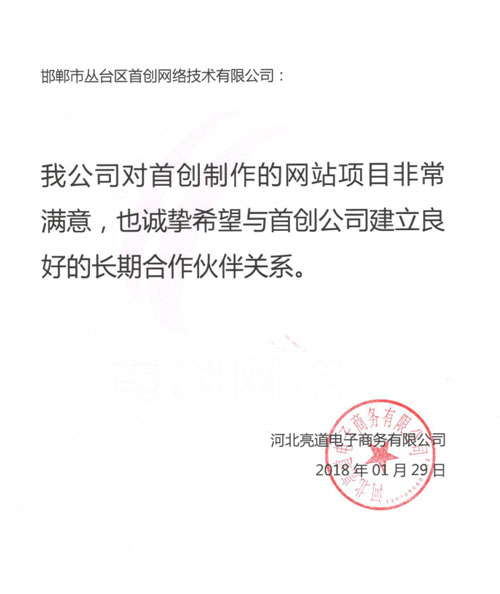 我公司對首創(chuàng)制作的網(wǎng)站項目非常滿意,也誠摯希望與首創(chuàng)公司建立良好的長期合作伙伴關(guān)系。